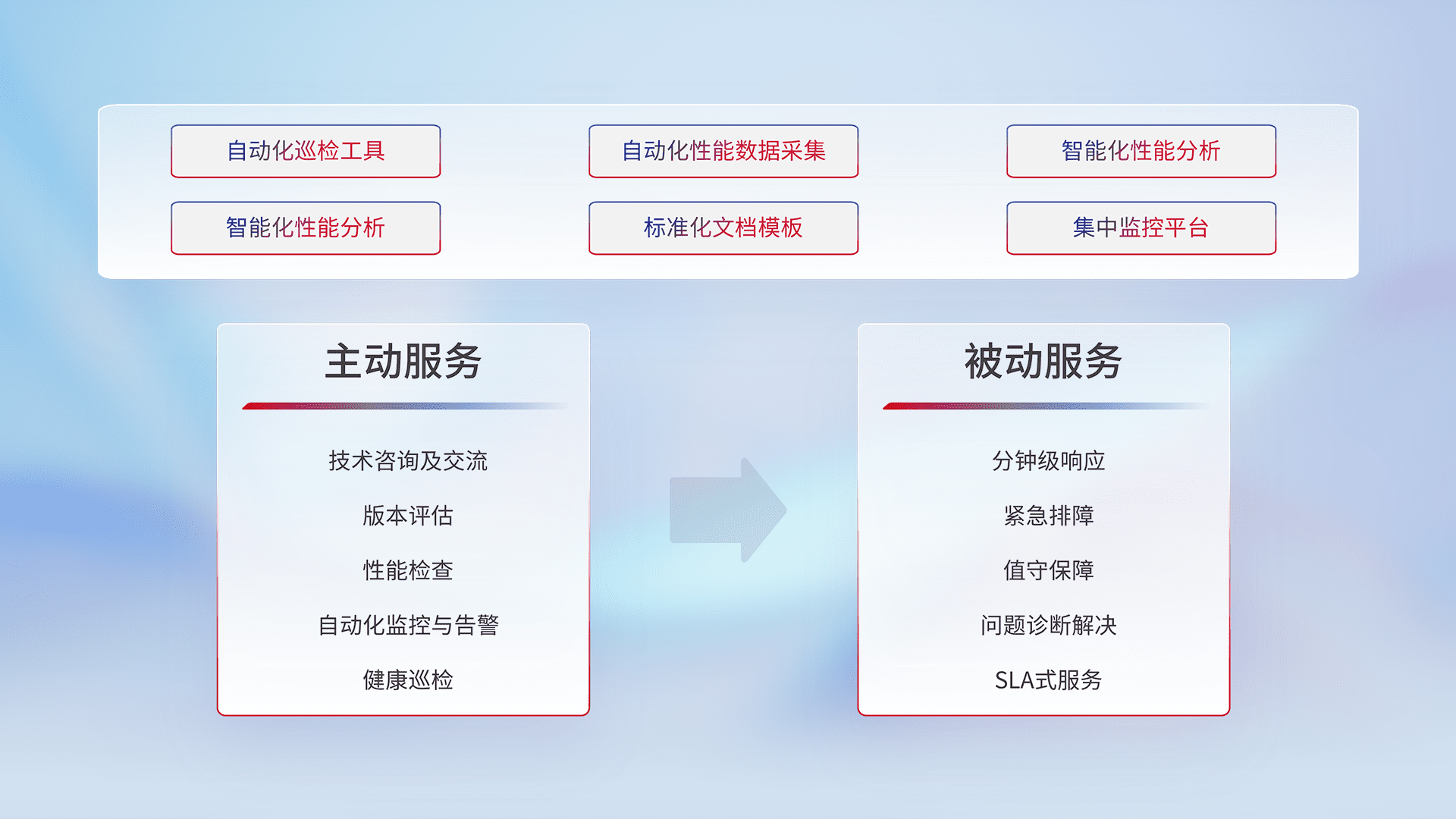 智能化工具和标准化文档,,保障服务质量,,提供主动服务(包含技术咨询、、、、版本评估、、、性能检查、、、、自动化监控与告警、、健康巡检)和被动服务包含(分钟级响应、、紧急排障、、值守保障、、、问题诊断解决、、SLA服务)。。