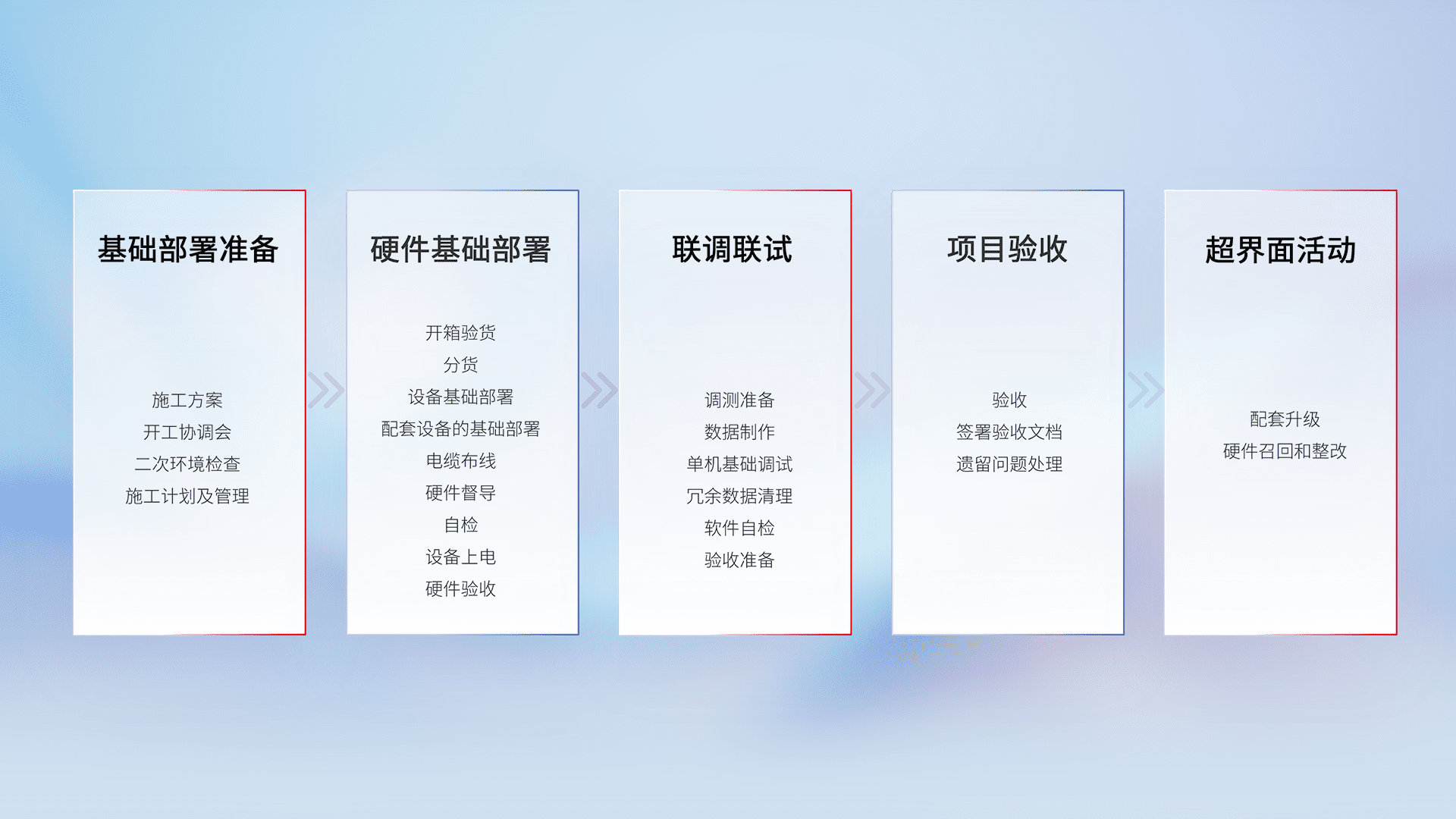 从基础部署准备、、、硬件基础部署、、、、联调联试、、、项目验收、、、越界面活动的全过程可追溯,,保证施工质量和进度。。。。