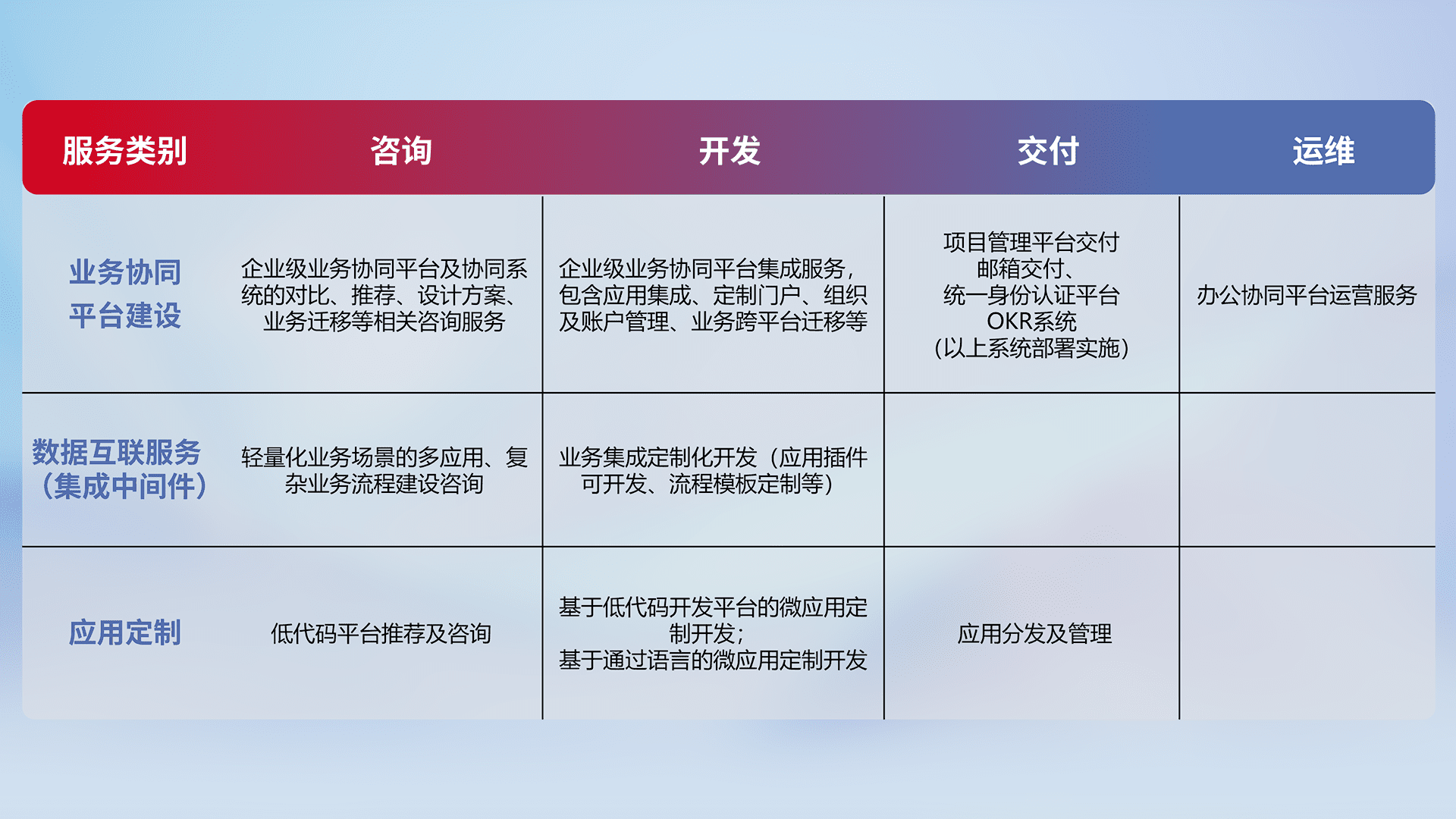 针对钉钉、、、、企微、、、、IDaas等平台级产品提供产品的规划、、方案、、交付、、定制化开发等服务,,,实现如统一协同办公、、、、智能客户服务、、、、混合会议管理、、、智能数据查询、、、、等业务场景,,,实现数字化转型。。。